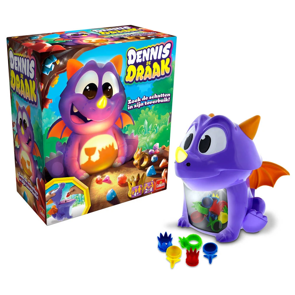 Zet Dennis de draak in het midden van de tafel en stop alle schatten via de mond in de buik. Het doel van dit spel is om zo veel mogelijk juiste schatten te verzamelen. Dit doe je door je hand voor de neus van Dennis te wuiven en goed vanaf de voorkant door de doorzichtige buik heen te kijken. Onthoud goed waar alle kleurenschatten liggen, want al snel kun je niet meer in de buik kijken. Nu licht de neus van Dennis op met een bepaalde kleur, rood, blauw, geel of groen. Doe de mond nu open en pak zonder te kijken een van de juiste schatten! Lukt het je, dan mag je hem houden en anders moet je hem weer terugleggen. Wie aan het einde van de rondes de meeste schatten heeft, wint.