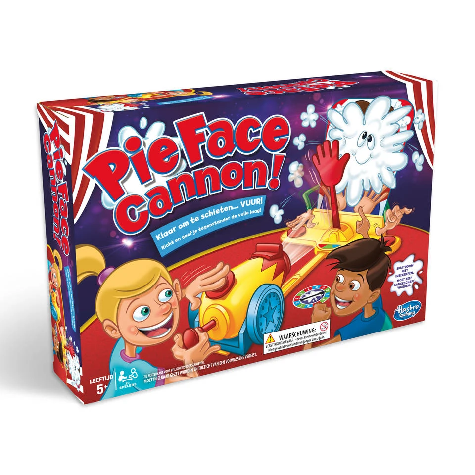 Een echte knaller is dit Pie Face Cannon spel! Spelers schieten naar hun tegenstander met een kanon vol slagroom. De slagroom is niet inbegrepen. Eén van de spelers zet zijn kin op de kinsteun achter het masker. De andere speler zet het kanon op scherp en lanceert een lading slagroom richting de tegenstander. De speler achter het masker kan de slagroom stoppen met de blokkeerhand. Spelers kunnen punten halen door de slagroom af te weren of door de tegenstander te raken met de slagroom. De eerste speler met vijf punten is de winnaar van het spel.